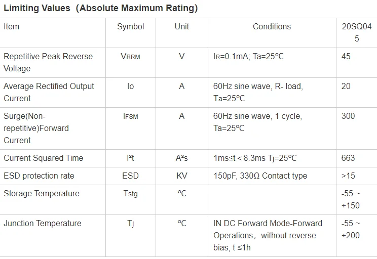 Photovoltaic schottky barrier rectifier 20SQ045 solar bypass diode used in PV Box with R 6 package