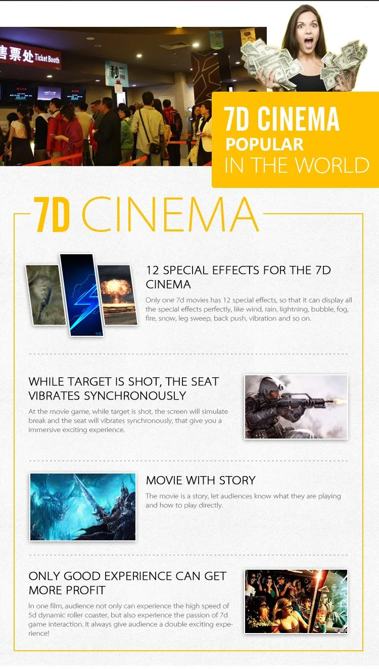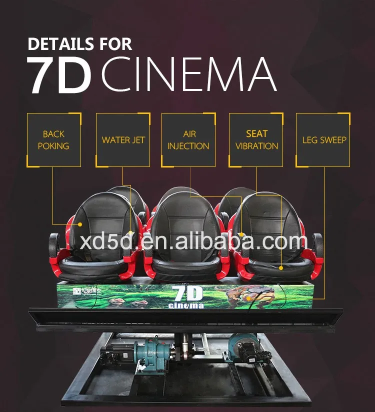 lightning blinking, fog simulation, bubble flying , air blowing, leg sweep, seat vibration, back vibration, etc. At the same time, we would experience the exciting motion of the dynamic seats, which drive us being in a fantasy wonderful world. For 7D cinema, it’s base on 5D cinema with more effects.