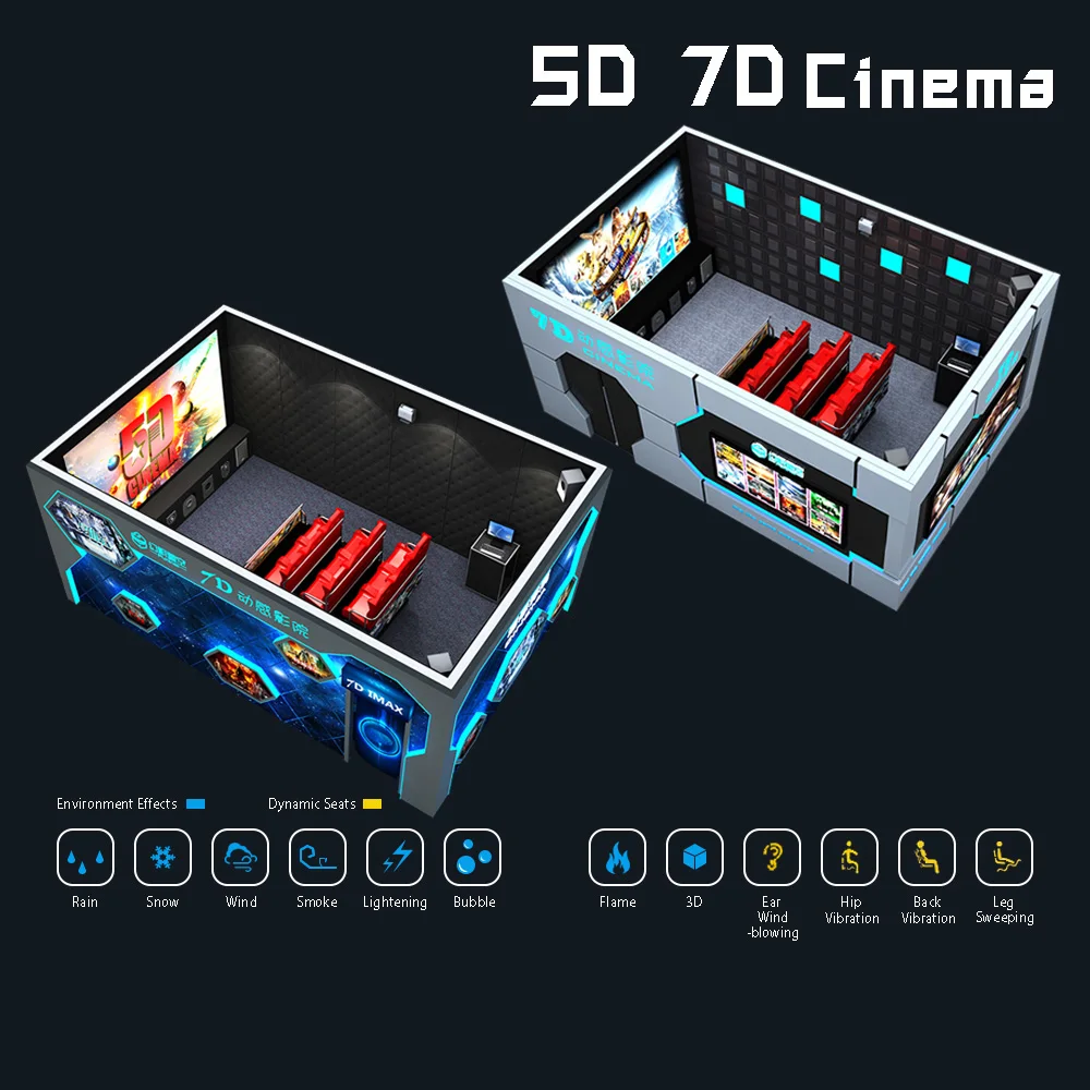 Those equipment included in 7d theater Master System + projection system + sound system +6 DOF dynamic seat system + environment + interactive simulation system effects tools into six parts. The main control system is mainly in the computer software, controls the operation of the entire theater. Projection systems, including the screen, projector. Dual projection technology, 7D and 5D can easily be converted to play, a equipment that can play both the 5d movie and 7d movie.