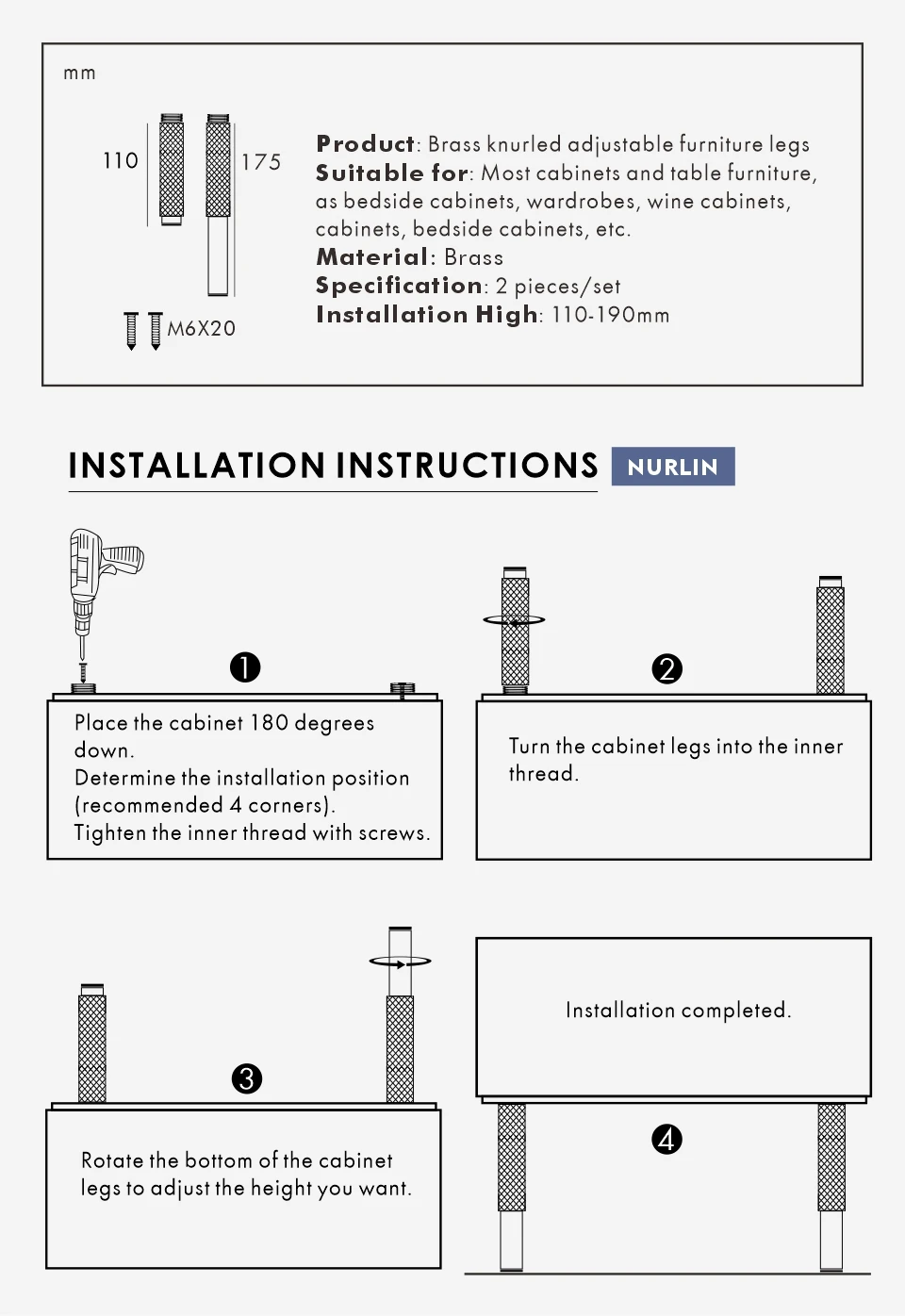 Nurlin Brass Knurled Diamond Cut Pattern Adjustable Height Furniture Cabinet Foot Firmly Supported Knurling Legs Black Gold