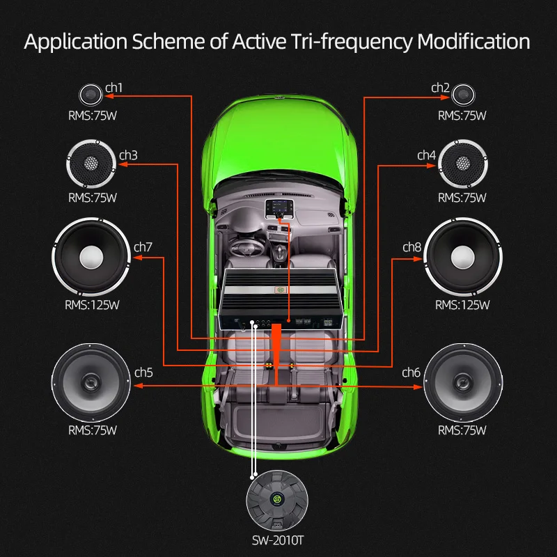 ●The CH7~CH8 amplifier outputs up to 125 watts per channel into 4 ohms, or 190 watts into 2 ohms, class D,THD < 1%.It can also be bridged into 4 ohms, producing up to 250 watts into 4 ohms or 380 watts into 2 ohms.