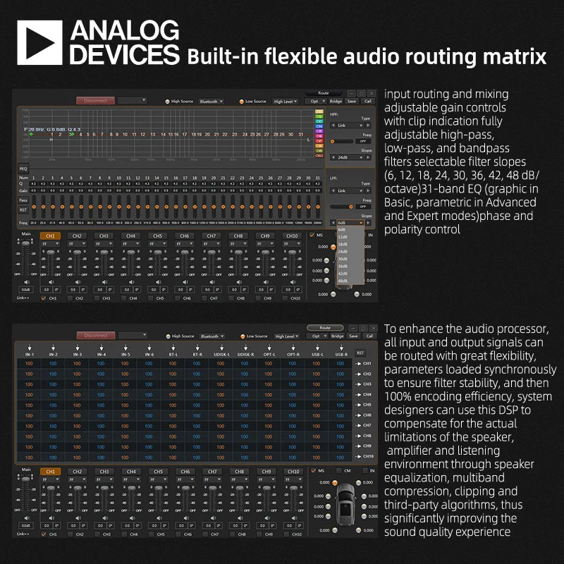 To enhance the audio processor, all input and output signals can be routed with great flexibility, parameters loaded synchronously to ensure filter stability, and then 100% encoding efficiency, system designers can use this DSP to compensate for the actual limitations of the speaker, amplifier and listening environment through speaker equalization, multiband compression, clipping and AE algorithms, thus significantly improving the sound quality experience