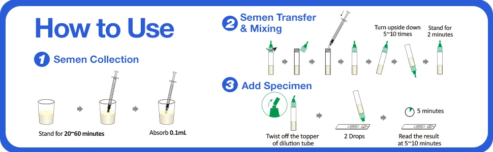 JHOME male fertility test is a quick test for home for qualitative detection of specific protein 10 (SP10) in . This simple fertility test lets you quickly know if your sperm count is in the normal range. As accurate as a laboratory test: more than 98% accuracy in detecting sperm concentration according to the cut-off value. Two lines mean normal (sperm count ≥15 millions/mL), one line means low sperm concentration (sperm count < 15 millions/mL). Comfortable and private: no hle, no embarrment and no inconvenience of a doctor's visit Testing the sperm count at home has never been so easy. Fast results: The sperm test for men is very easy to use and the results can be read within 5-10 minutes. Re and trusted brand: This sperm rapid test is offered by JHOME, a brand dedicated to being the best provider of home testing. Our experienced and professional customer service is at your disposal for all incoming questions.