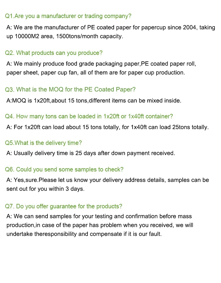 6oz | (170~190)gsm+15PE | 16oz | (230~260)gsm+15PE+15PE | |