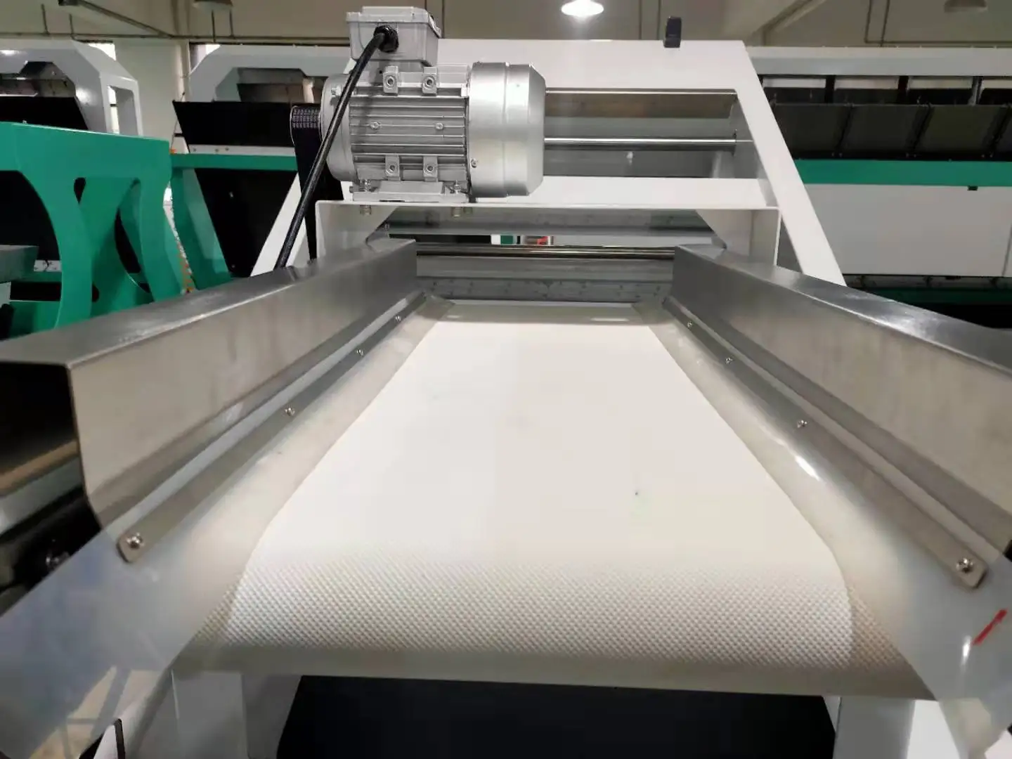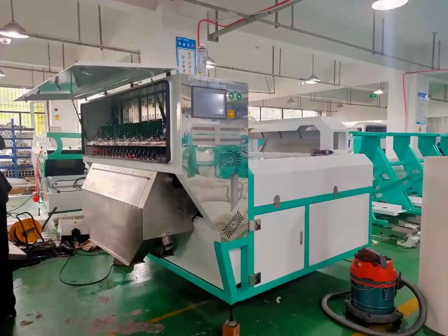 Raw materials are put into the machine from its material hopper on the top, vibrated by vibratiory feeder and sliding along material chute into the zone of observation in sorting chamber through sensors and background plate. Under the effect of lamps source, CCD sensor receives compound light from materials being sorted. According to the light intensity and color changes, make the system produce output signal and drive solenoid valve(ejector) to work, ejecting the discolor grain to reject chamber and good materials continue to fall into the finished accept chamber