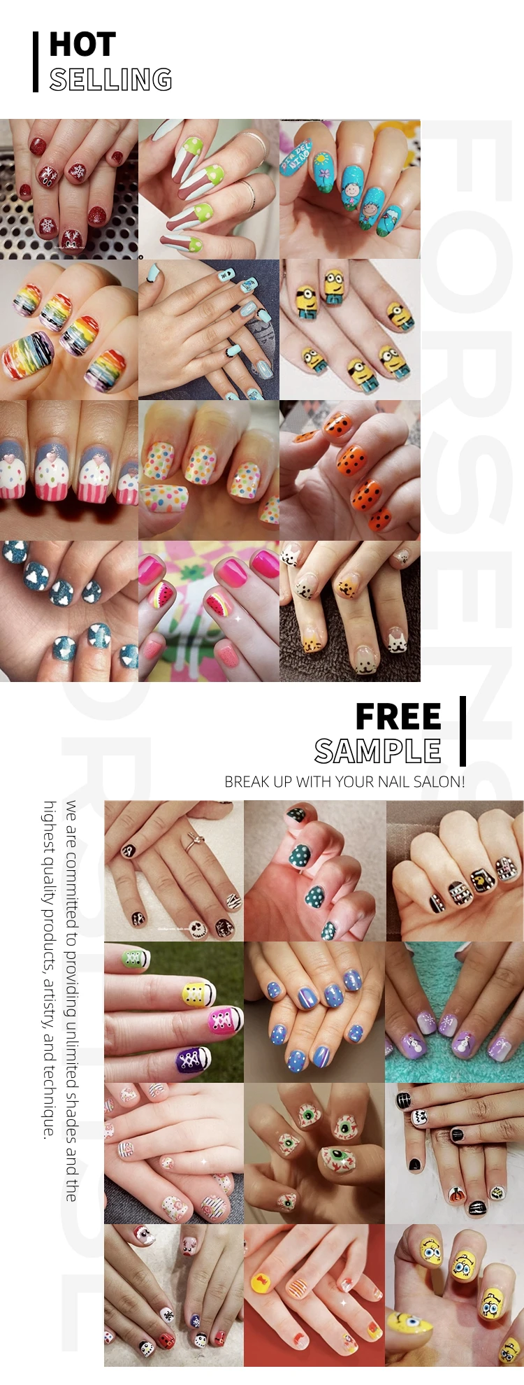 | Custom items | 1,Nail length, shape,color,pattern,material can be customized 2,Application Kit Configuration , Quantity can be customized 3,Logo & packaging can be customized | ||
