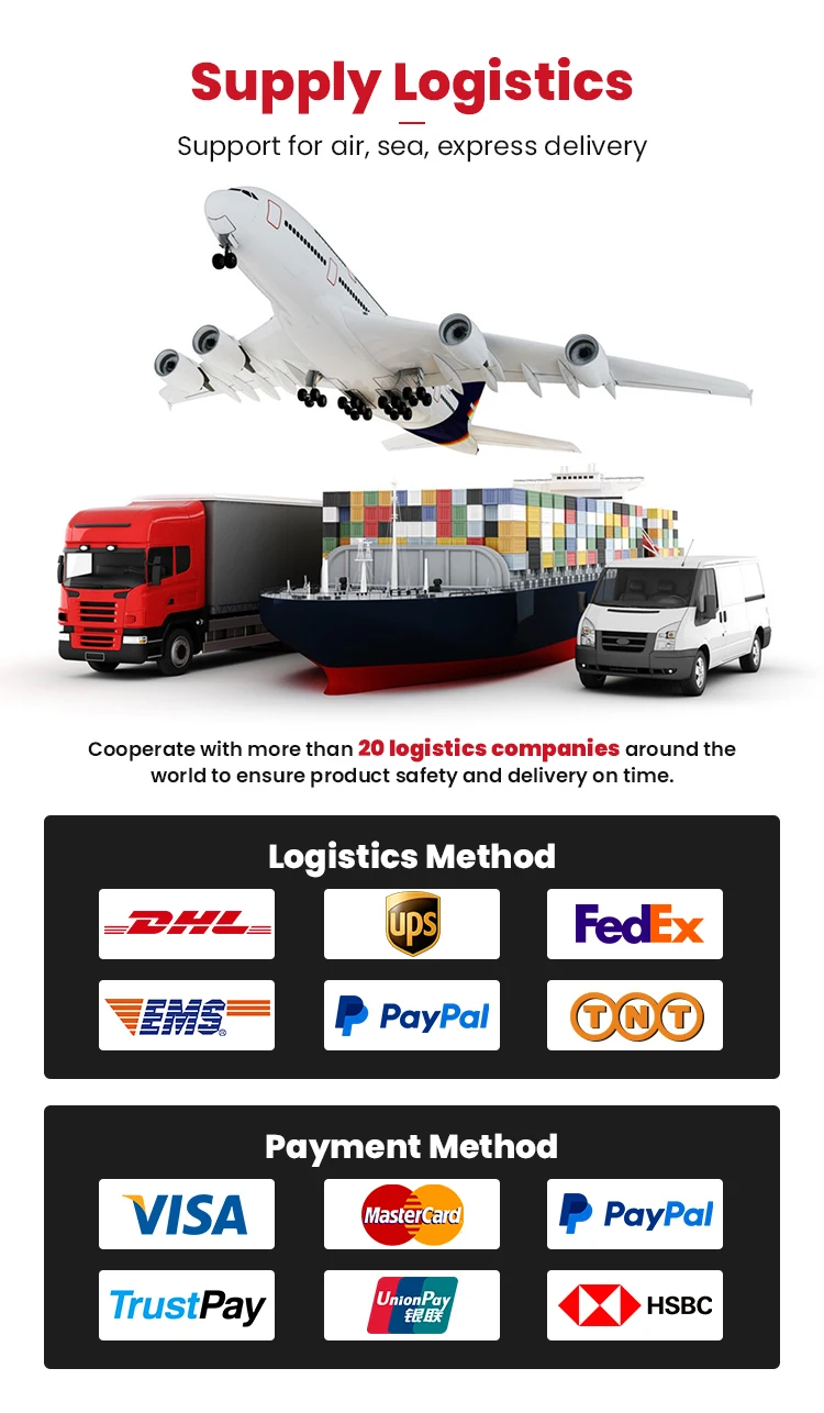 5. Payment and transportation? T/T, Western Union, Visa, Mastercard online banking payment. Shipping by DHL, UPS, EMS, FedEx, by air, by sea.