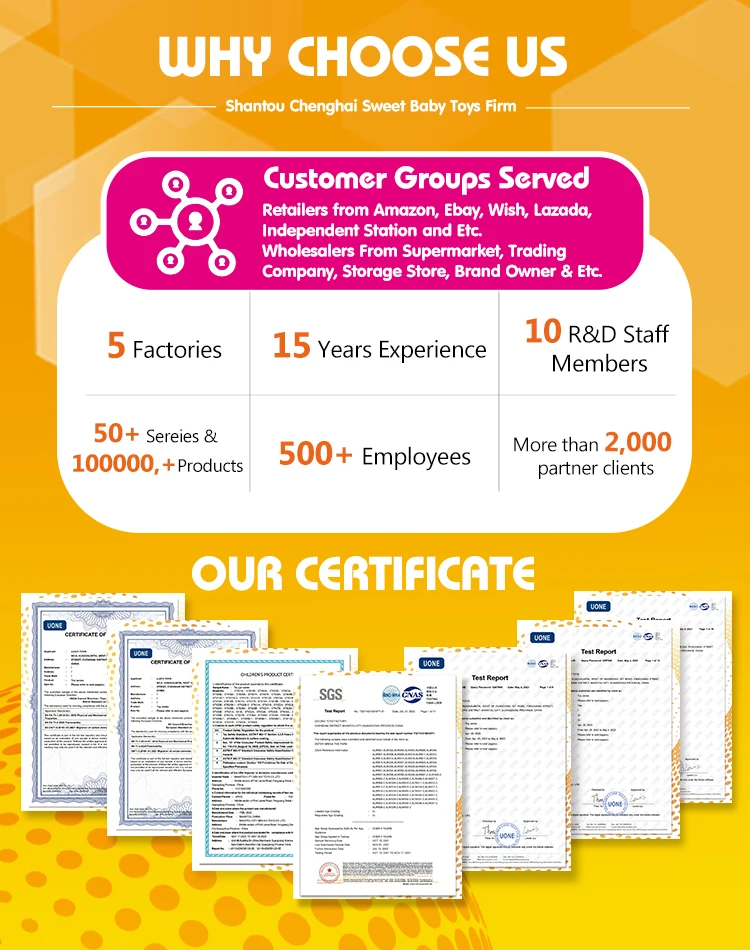1. What is your Payment term? ---TT, LC, Western Union, Paypal, Escrow is could be accept. 2. What is your Trade term? ---EXW, FOB, CNF, CIF is also ok. 3. What is the Loading Port? --- Shantou, Shenzhen. 4. What is your MOQ? ---MOQ of most our products is 1 carton, different items will be different. We have indicated the MOQ for each item in the price list. 5. What is your Product Warranty? ---As Europe market, we have EN71, 7P and other international safety standard for our products. ---As USA market, we have ASTM, HR4040 for our products. ---As other market, international safety standard certificate is also be provided.