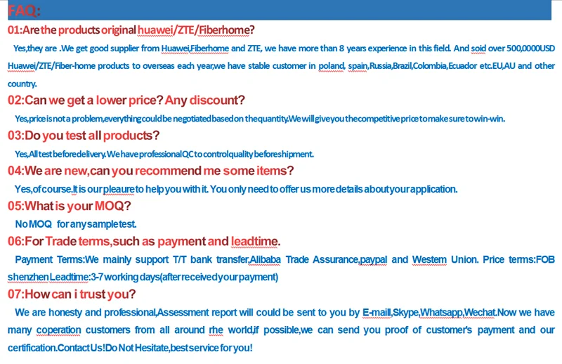 We are a company specializing in the production and sales of rectifier modules, switches, distribution cabinets, base station equipment, optical modules, optical fiber equipment and other products. Our products are various, with high quality, reasonable price and perfect design. Our main sales brands include network base station equipment of major brands such as Huawei, ZTE, Fiberhome, Ericsson, Alcatel-Lucent, Nokia Siemens, Nortel and Cisco. Our products have a complete product chain and service providers, a large number of long-term spot, complete varieties, in addition to various brands of unpopular, discontinued devices procurement also has an advantageous channel. Specializing in providing maintenance services, repair services and spare parts support for major communication operators, communication private networks and enterprise network users. We welcome new and old customers from all walks of life to contact us to establish future business relations and common success. We promise that all products will undergo strict quality testing and aging testing, plus load testing to ensure product quality and provide high-quality after-sales.