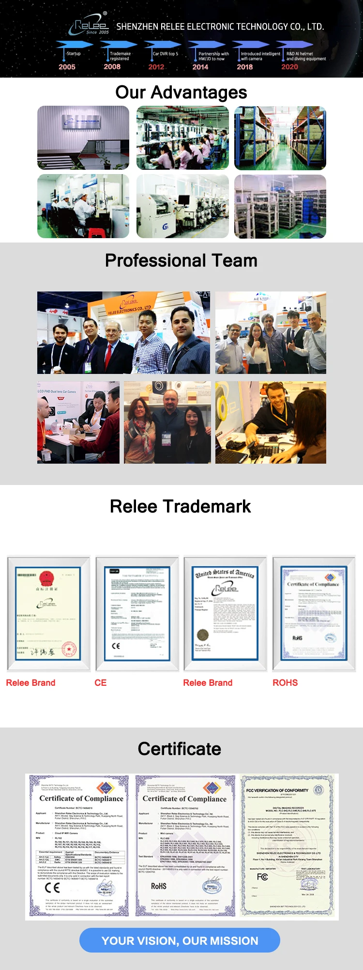 Founded in 2005, Shenzhen Relee Electronics & Technology Co., Ltd. is a manufacturer specializing in audio-video imaging products like car dash camera, action sports camera, smart wifi camera or other similar products you can see online at www.relee.cn. Since that time on, Relee has gained world-wide fames by providing all-round OEM/ODM solutions to global branding partners esp. from Western Europea, USA, Russia, Japan, Australia and other regions. Relee is not only a long-standing Alibaba Gold Supplier since 2005, and also a fast-growing leader in developing /consolidating independent supply chain of resources among China Mainland and overseas. Our factory is certified with ISO9001 and EICC/BSCI by top internaltional companies. With our collaborative efforts, you'll witness a prosperous development.