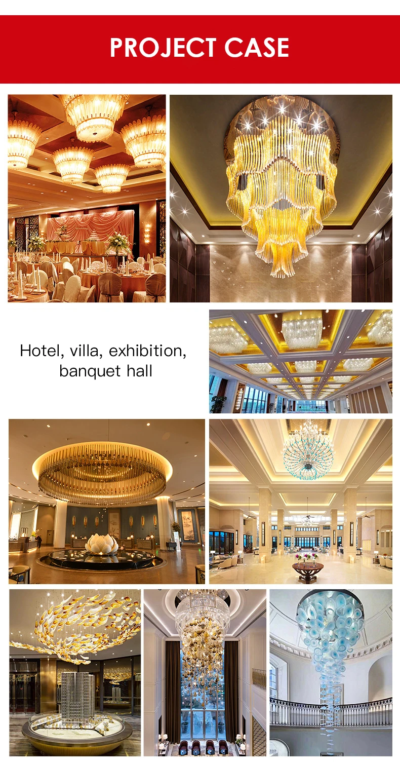 Size customization from small household chandelier to large hotel lobby pendant light, shopping malls hall chandelier, villa staircase chandelier, church chandelier,wedding chandelier; Lighting materials can be customized including iron,brass, aluminum, zinc alloy, stainless steel, etc.;