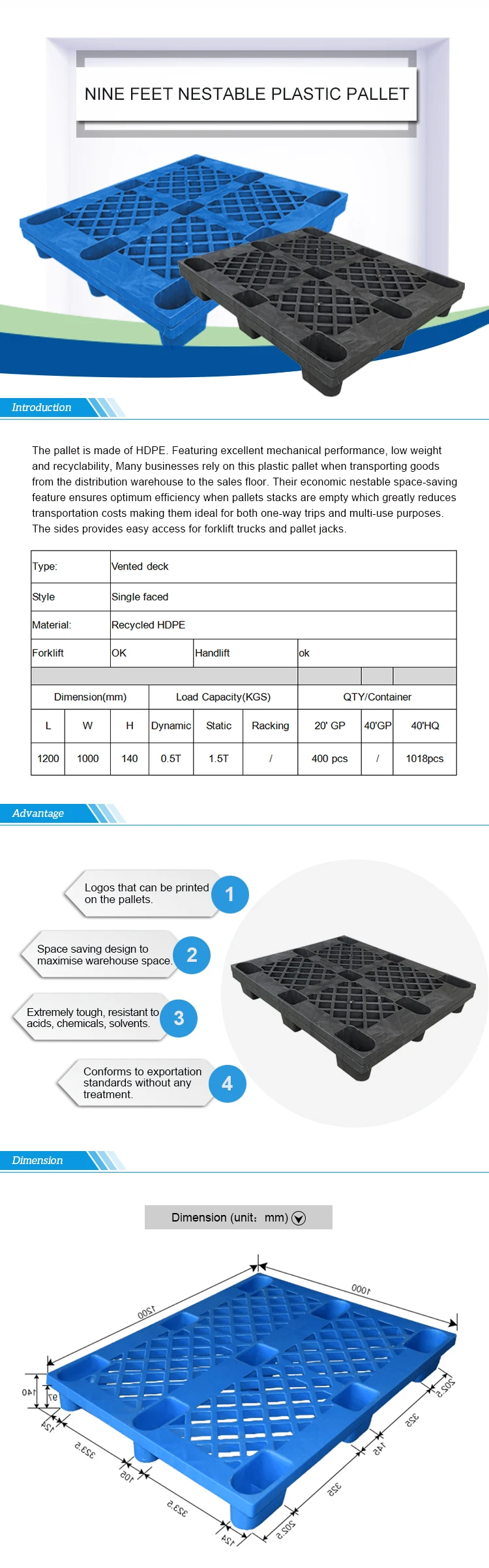 Item Name | 1210JP-Q plastic pallet with 9 legs |