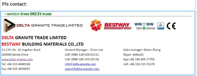 One of leading exporter of natural stone products located in the picturesque port city Yantai, Shandong province in Northern China.It is established in 2003 and has already successfully exported different of stone products to European countries since 1998.Delta specialize in the granite, limestone, sandstone, basalt, slate and marble for more than 20 years with good quality and competitive prices.