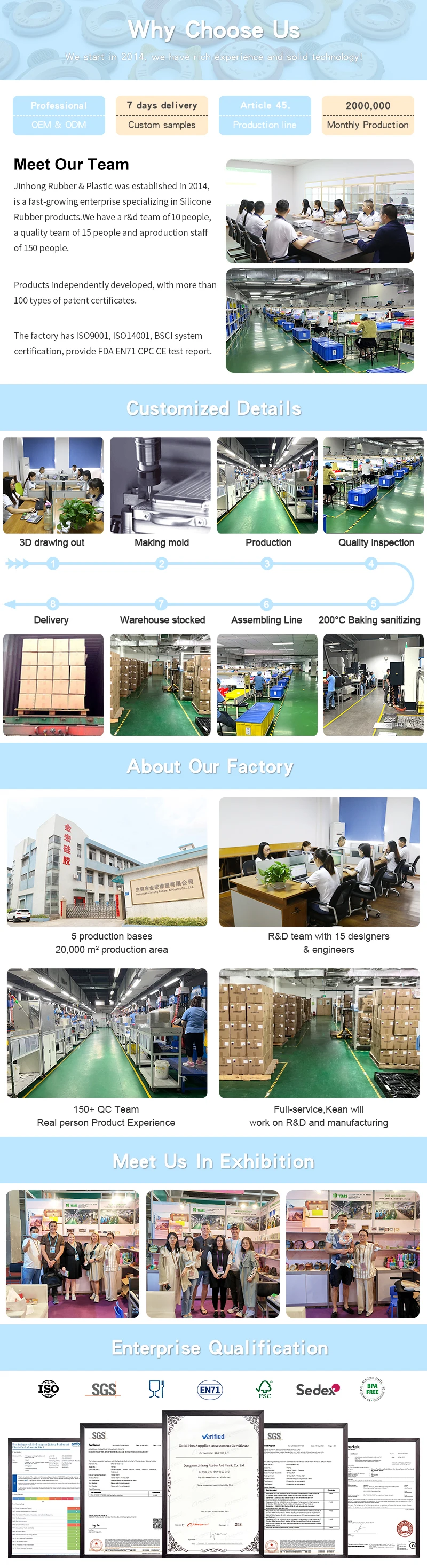 Jinhong Rubber and Plastic was established in 2014 and is a rapidly developing silicone rubber product enterprise. We have are search and development team of 10 people, a quality team of 15 people, and a production team of 150 people. The product is in dependently developed and has over 100 patent certificates. The factory has ISO9001, IS014001, BSCI systemcertification, and provides Food and Drug Administration EN71 CPC CE test report | ||