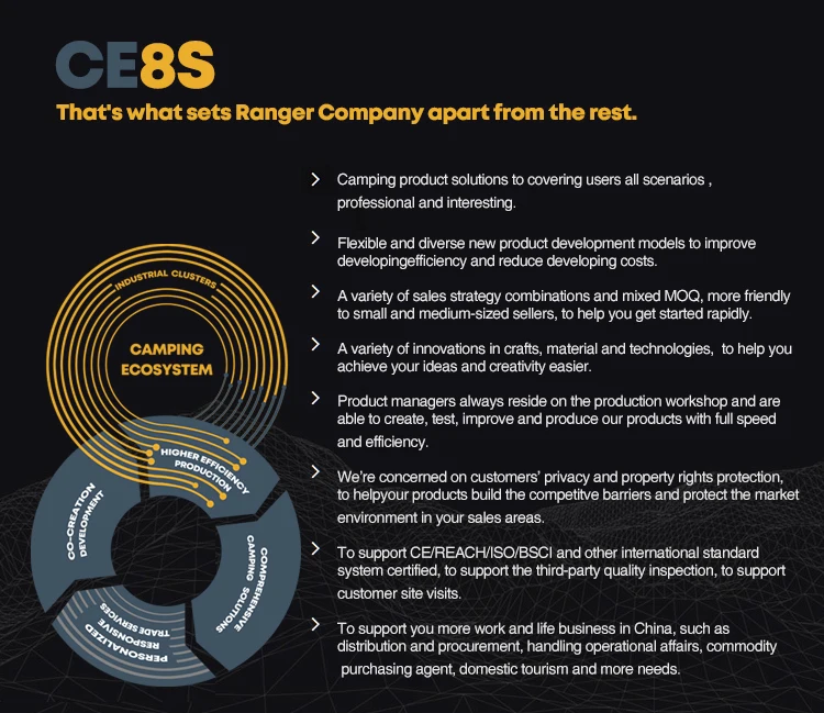 In addtion to providing OEM/ODM camping products and traditional trading service, you also can get the professional & responsive product solutions. Our goal is to help institutions and individuals build stronger outdoor products scenario and outdoor market competitiveness by combining made-in-China strength, RANGER [CE8S] products R&D strategy.