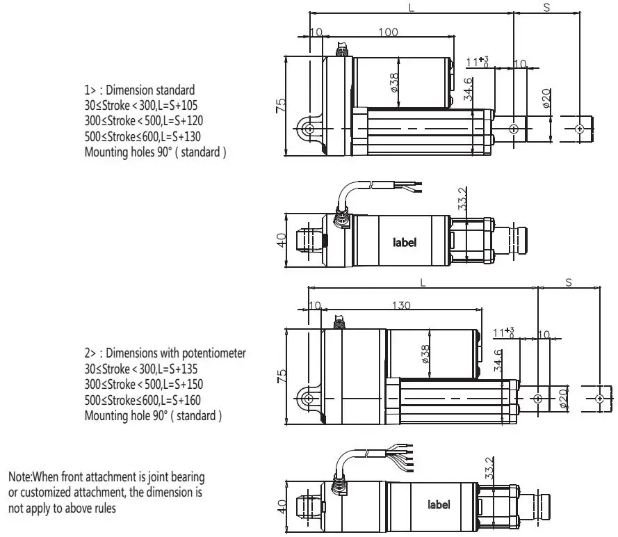 Feature / Benefits Lubrication for longer life time Installation hole can be adjustment Voltage: 12V / 24V DC Push force: 1500N max Stroke: 50mm-500mm Protection Class: IP65 Limited Switches: built-in Low noise Life time 50 000 complete cycles Ambient temperature -26°C to +65°C OPTION: Potentiometer/ Hall Sensor