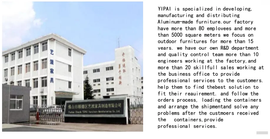 Yipai Furniture specialized in developing ,manufacturing and distributing aluminum outdoor furniture ,outdoor rattan sofa ,chair and table,stainless steel teak wood furniture,hotel,garden furniture...