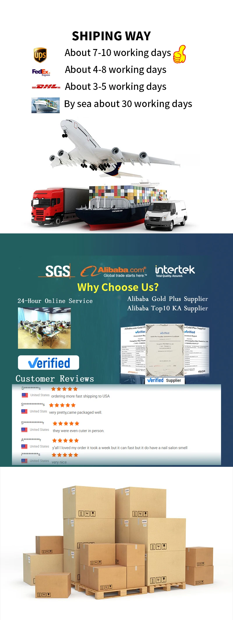 By sea, by air, by express(DHL, it is about 3 to 4 days, FedEx IE, UPS Expedited, EMS, TNT etc.).