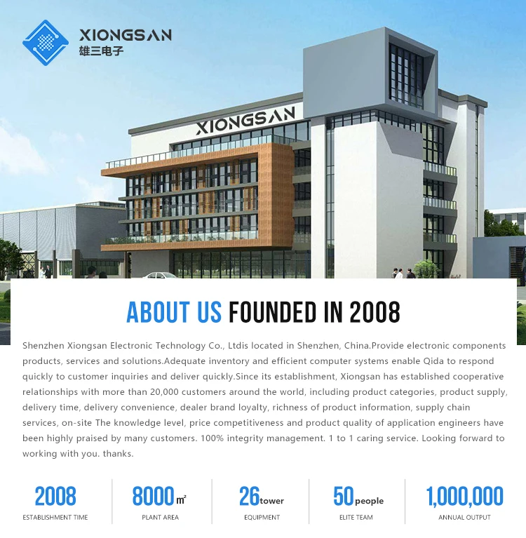 Shenzhen Xiongsan Technology Electronics Co., Ltd. is a professional distributor of electronic components, providing one-stop solutions for electronic components products and services. The warehouse stores all kinds of semiconductors, memory, microprocessors, passive devices and other components, with a total value of 50 million US dollars, and more than 50,000 kinds of products in stock. Adequate inventory and efficient computer systems enable QIDA to respond quickly to customer inquiries and deliver quickly. Since its establishment, "Xiongsan" has established cooperative relations with more than 20,000 customers around the world, including product types, product supply, delivery time, delivery convenience, dealer brand loyalty, rich product information, supply chain services, field application engineers' knowledge level, price competitiveness and product quality, which are highly praised by many customers. Sincerely look forward to cooperating with you. thank you