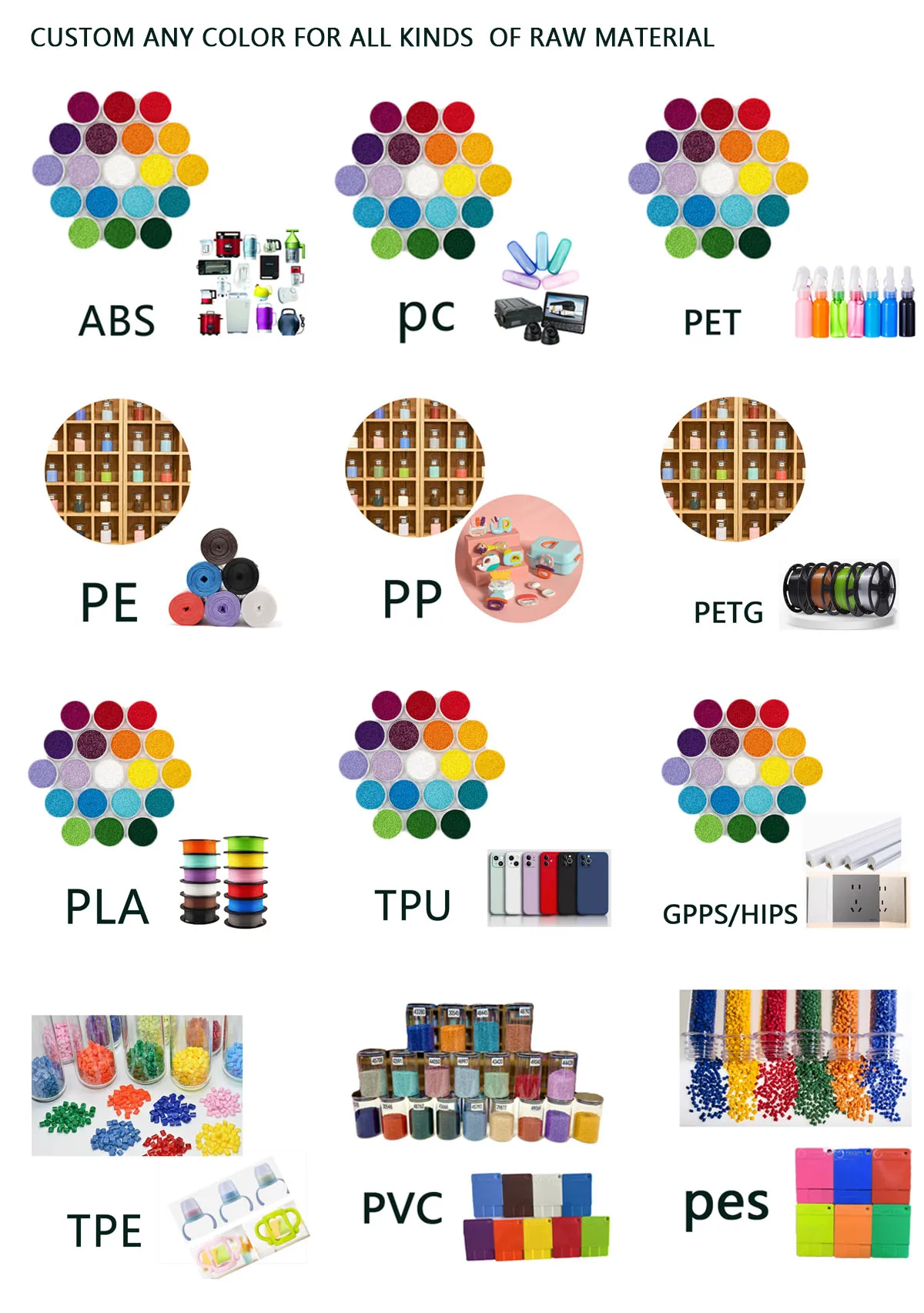 We supply all kinds of plastic raw material and custom masterbatch and additives globally since 2006 with R&D center based in Guangzhou and production capacity up to 5,000Tons annually.