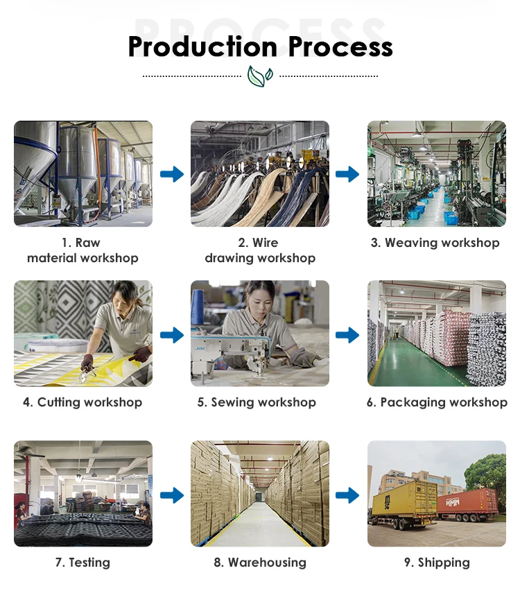 Raw material inventory is maintained at about 1000 tons for a long time, color matching and anti-UV are purchased high-quality color powder and anti-aging UV from Germany BASF, and the most advanced three-screw granulator is pelletized by its own factory to ensure that the color fastness of the product is above 4.0 level and the color is distributed and stable to ensure the service life of the product .