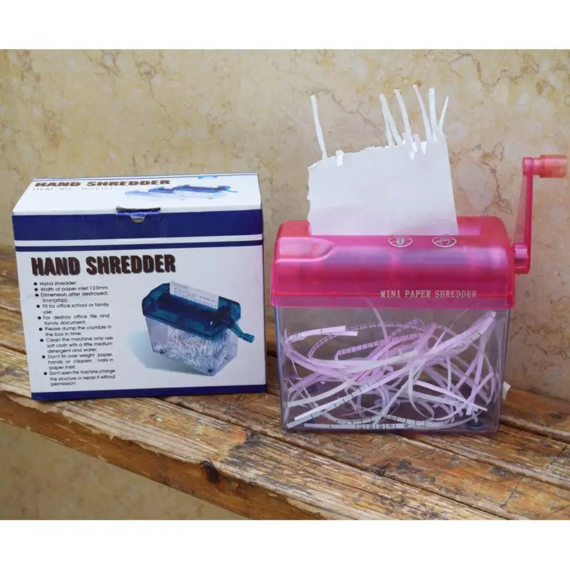 1. 100% Brand New and High Quality 2. Type : Paper Shredder 3. Material:EVA 4. Size:20x10x14.5cm 5. Color: Blue Pink Oriange Black 6. For home or office receipt or invoice disclosure of personal information 7. Paper documents that can be crushed to information makes impossible to identify.
