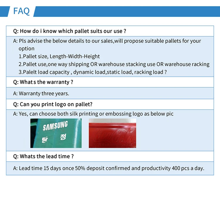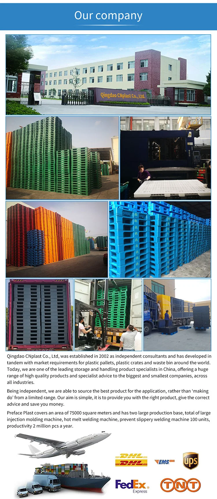 Our company is a medium-sized company, having 400 employees, established at 2000 based in China.We have two huge manufacturing facilities located in : 1- Shanghai,China 2- Qingdao, Shandong, China With total area of 90,000 meter square, 60 sets of production lines, and 700 Plastic injection molds ENLIGHTENING Annual Turnover reach 90 -100 million us dollar, overseas sales make up 30% of the total revenue ,we are proud to be one of the biggest exporters for plastic pallets around the world.