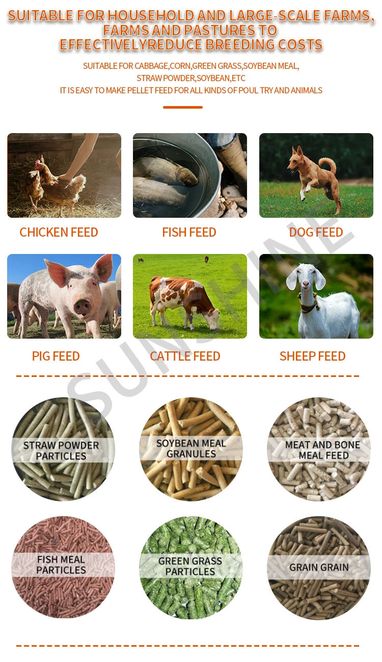 Sunshine Industry Feed Pellet Machine is a machine that mixes powdery raw materials by extrusion molding, and the finished product is cylindrical pellet feed. The raw materials are dried in and out. No water or drying is added during the granulation process. Natural heating to about 70-80 °C can make starch gelatinized protein solidify and denature. , Long-term storage, promote the palatability of livestock and poultry digestion and absorption, shorten the fattening period of livestock and poultry.