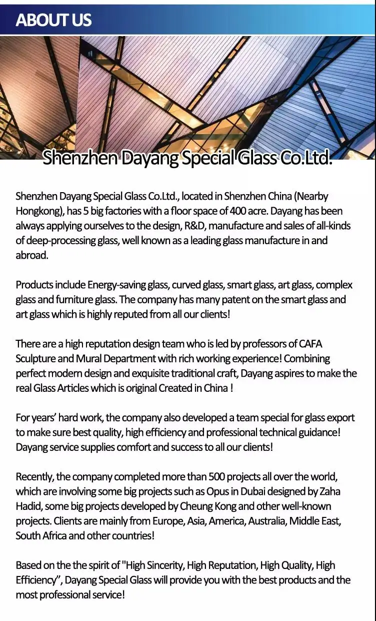 1. Why choose DAYANG Glass? With many years of glass processing experiences for abroad, we have well-found glass processing facilities and professional technology to guarantee the quality and service.
