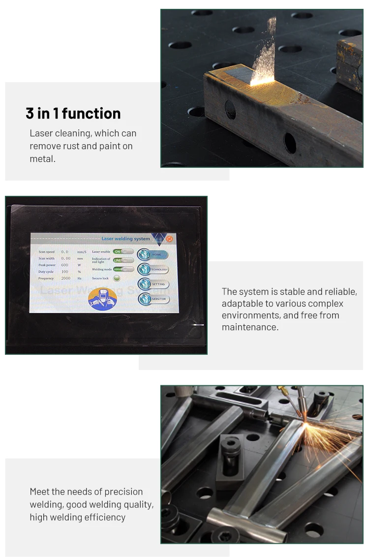 1.How can I choose the most suitable machine? This 3 in 1 laser welding cleaning and cutting machine suitable for welding more ,and need laser cleaning function and simple cut sometimes, please tell us what materials you want to weld, what about theirthickness?