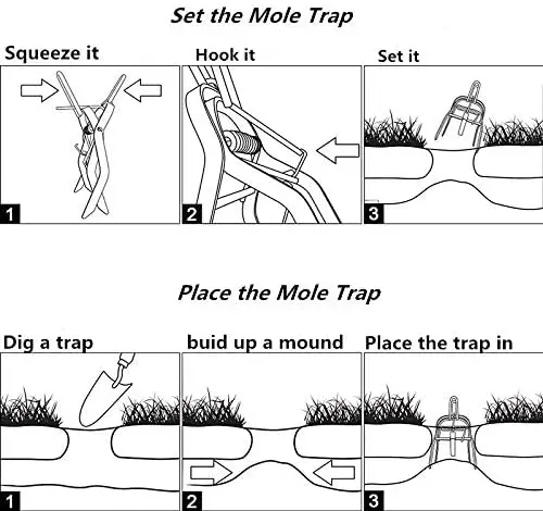 **Look for mole areas in your garden. **Hold the trap in your hand and place it in the active area to ensure that the mole will pass through the trap. **Check if the trap triggers, if it does, the mole has been captured. **Remove the mole from the trap and dispose of it according to local laws and regulations.