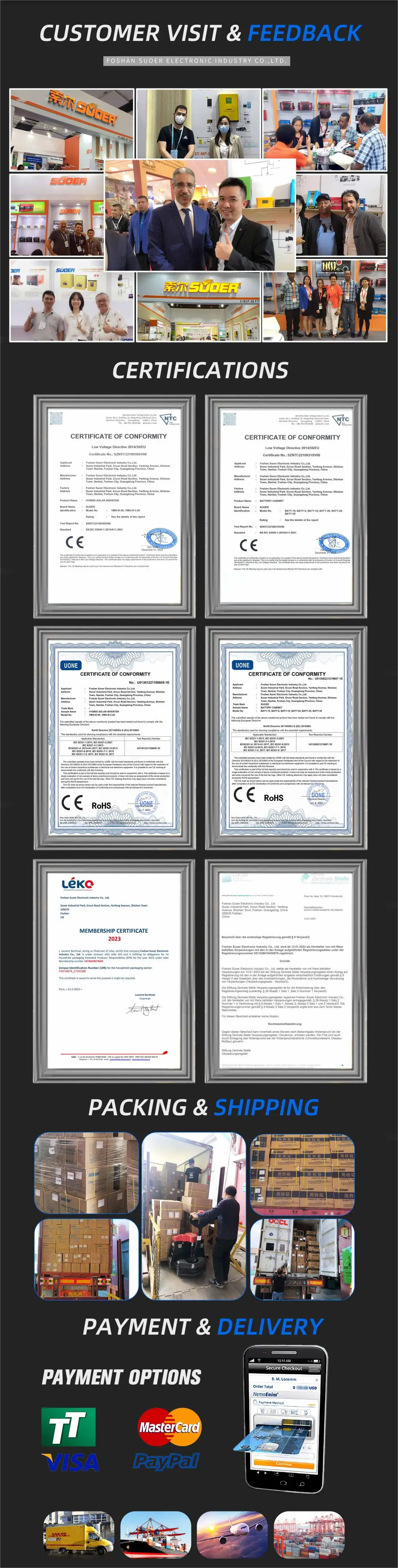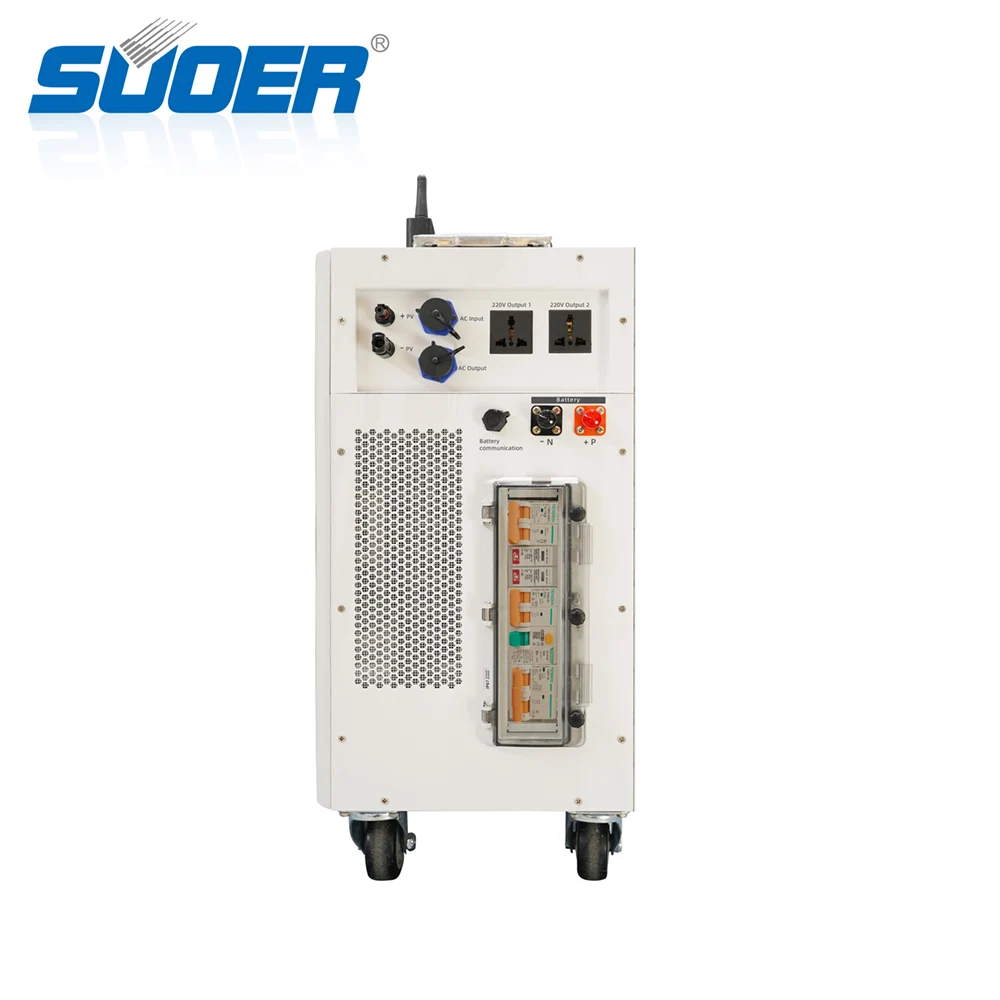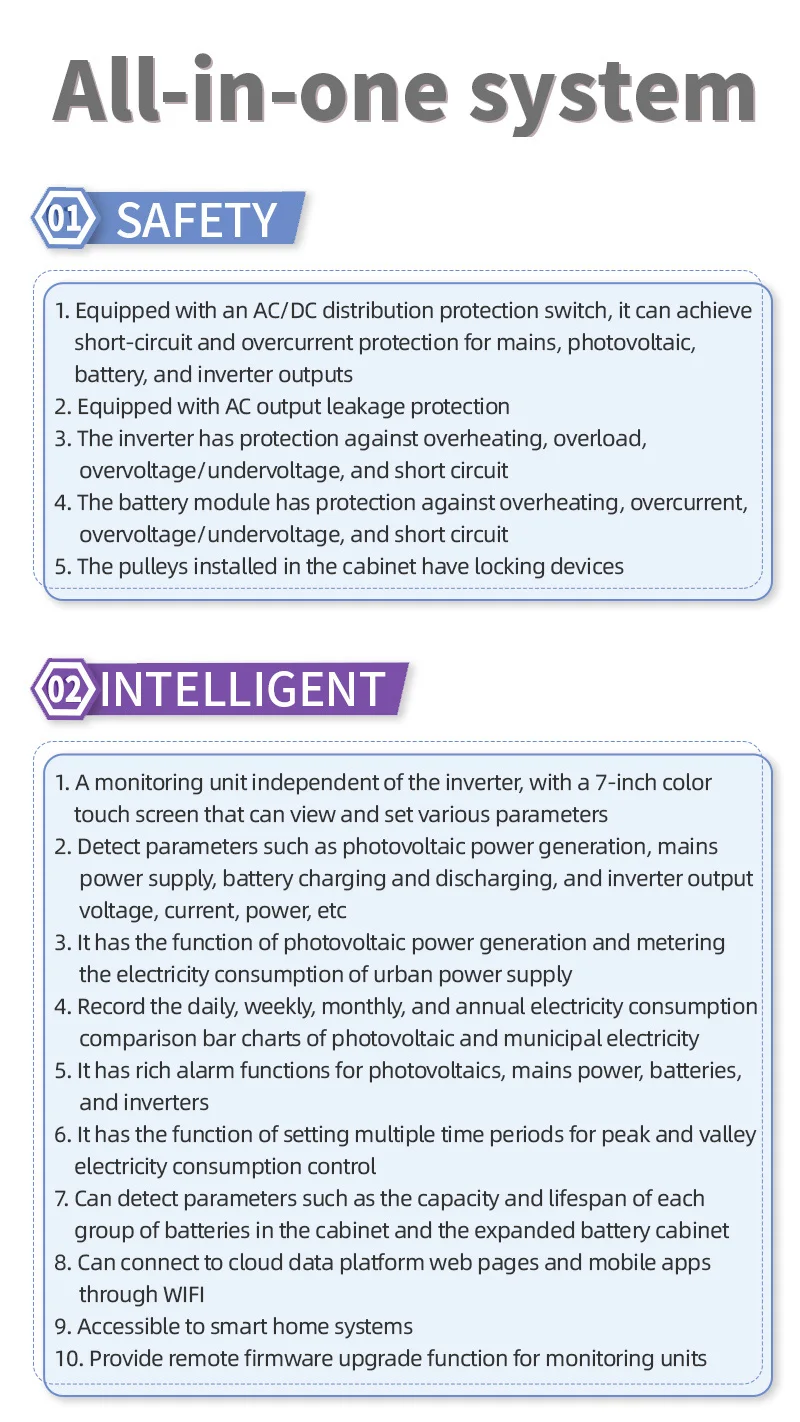 secure | ● Built-in AC/DC distribution protection switch, which can realize short circuit and overcurrent protection of mains, photovoltaic, battery and inverter output ● With photovoltaic lightning protection and AC output leakage protection ● Inverterequipped with over temperature, overload, over/under voltage and short circuit protection ● The battery module has over temperature, over current, over/under voltage and short circuit protection ● The cabinet has a mounting plate, which can be fixed on the wall and will not tip over ● Comply with EU LVD and EMC directives |
