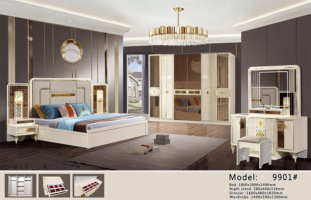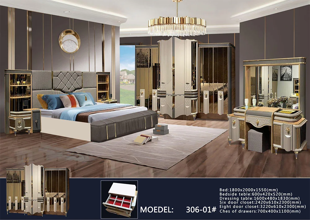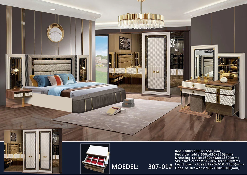 Size | Bed size:1800mm*2000mm*1200mm 2 Beside table size:480mm*340mm*500mm Dresser&mirror&stool size:1000mm*390mm*160mm 6 doors wardrobe size:2130mm*540mm*2050mm | ||||||