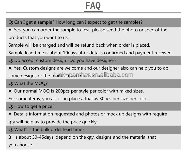 Sample fee | Base on design,Sample fees can be refundable if bulk order reaches to 100 pcs /design/color mix sizes |