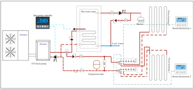 When the heating and hot water is in need , we suggest to put coils in the water tank, then the floor heating water wont mix with the shower water . Hot water will be priority , and after reaching the preset water temp , the heat pump will change to floor heating mode automatilly.