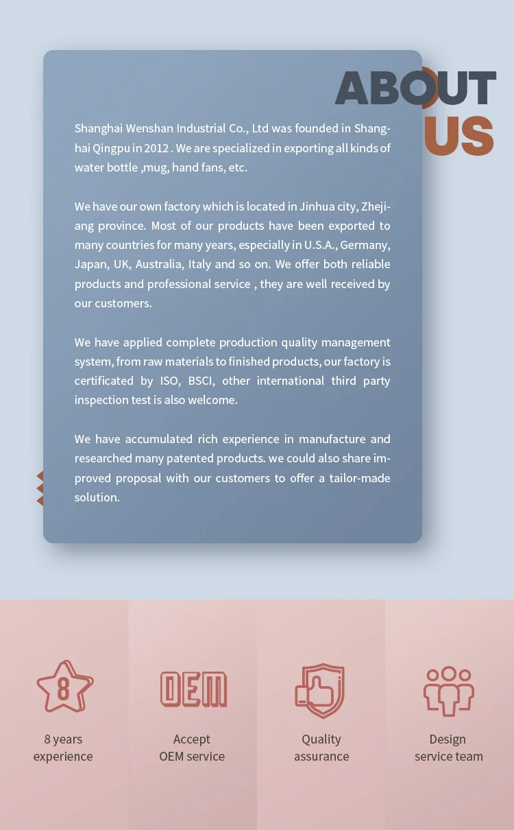We are based in Shanghai, China, start from 2012,sell to North America(40.00%),Western Europe(30.00%),Domestic Market(10.00%),Southeast Asia(10.00%),South America(5.00%),Oceania(3.00%),Mid East(2.00%),South Asia(0.00%),Eastern Asia(0.00%),Southern Europe(0.00%),Central America(0.00%),Northern Europe(0.00%),Africa(0.00%),Eastern Europe(0.00%). There are total about 11-50 people in our office.