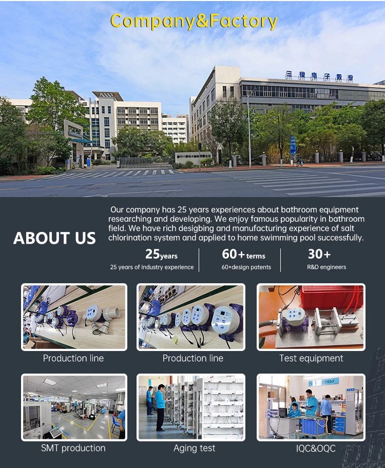 1) Are you manufacturer? Sure, our factory is located in FoShan,China. Near GuangZhou. Welcome to visit us when you come to China. 2)What’s MOQ on salt chlorinator? You could order sample for testing. We don’t have MOQ request , but price is depends on your order quantity. 3) What the production lead time for order? For sample order, lead time is one week. For bulk order, lead time is about one month. 4) Can you put our brand on salt chlorinator? Yes, we could offer OEM service. But MOQ is requested. 5) What’s your warranty? Warranty is one year.