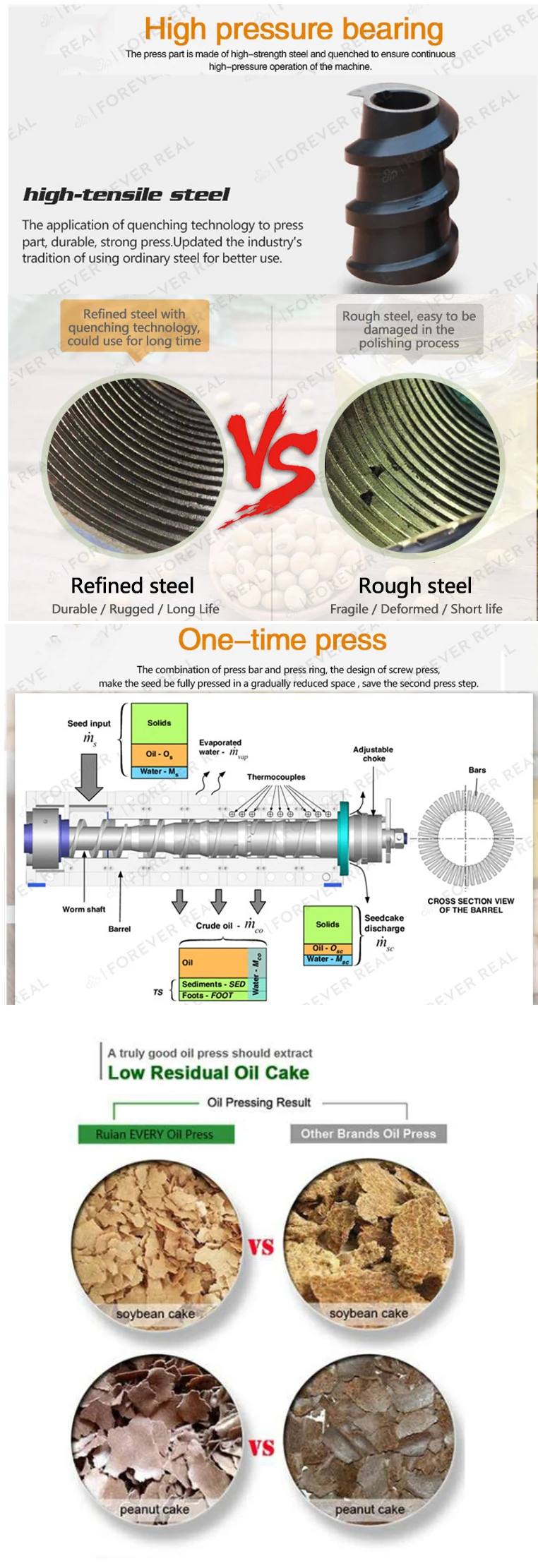The press cage is mate of cast iron, feeding part and shaft are made of carbon steel. And whole machine coated with anti-rust oil, worm is made of high-strength steel.