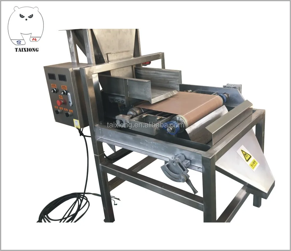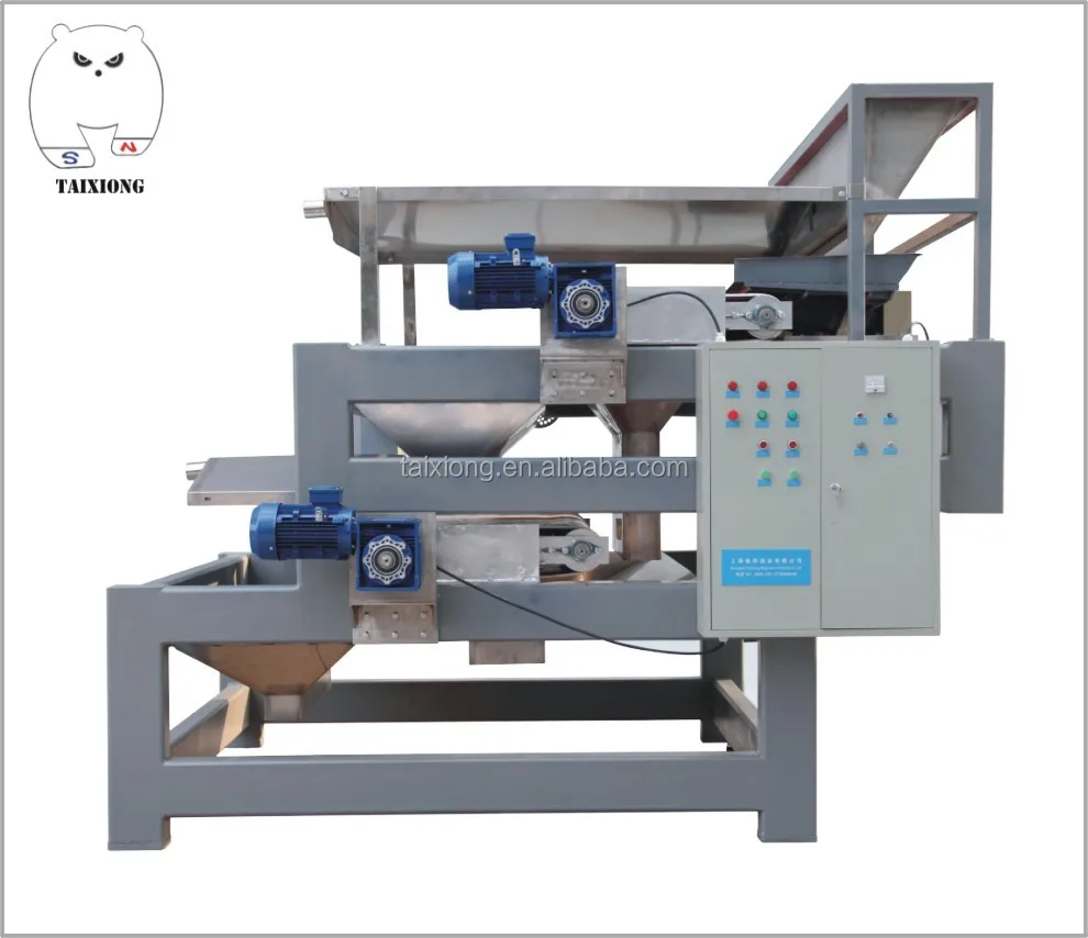 Magnetic soil removal machine mainly takes advantage of the small amount of iron contained in the soil and uses high-strength magnets to separate it. Its main structure includes fuselage frame, conveyor belt, magnetic roller, electromagnetic vibration feeding, etc. During operation, the material runs along the belt. When the material flows through the magnetic roller area, the material exhibits a parabolic free fall motion. During this process, the soil is attracted by the high-strength magnet, and the trajectory changes and is separated by the partition.