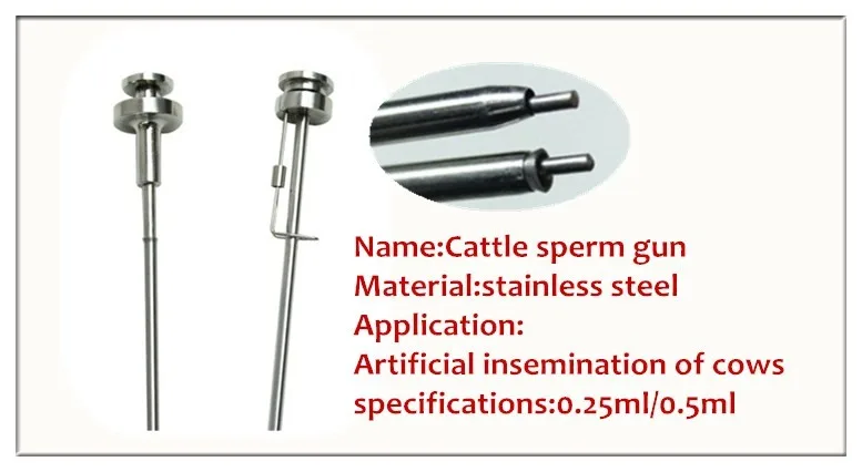 1.Artificial insemination gun/inseminator is designed for straw semen insemination for cow as a better replacement as Cassou gun. 2.There are two norms, 0.25ml ,0.5ml and universal, for the gun .It is made by stainless steel and with a wire lock on it. This half ring wire lock make it rather easy to put a sheath on the gun. 3.After put a sheath through the lock, push the fixing ring up, the sheath will be fixed. When insemination is done, put back the fixing ring and take the sheath off. |