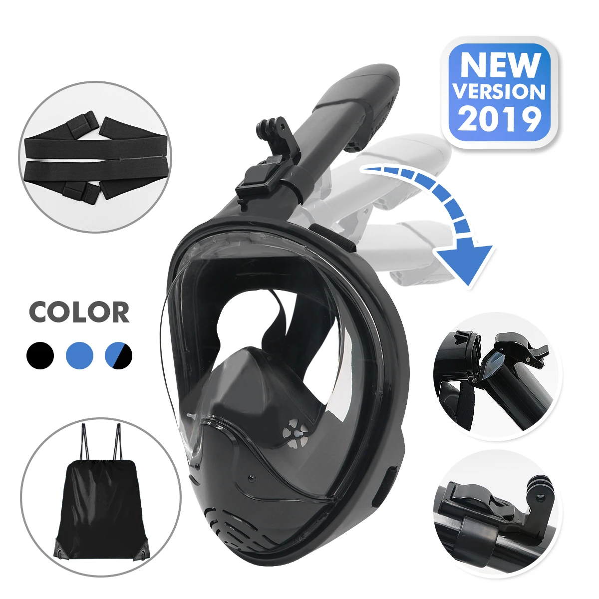 Feature | New 180° Panoramic Broad View Design + Easy to Use/Dry Snorkel Technology + Anti-Leak/Easy to Breathe + Anti-Fog/Portable with Removable Snorkel Tube and GoPro Mount |