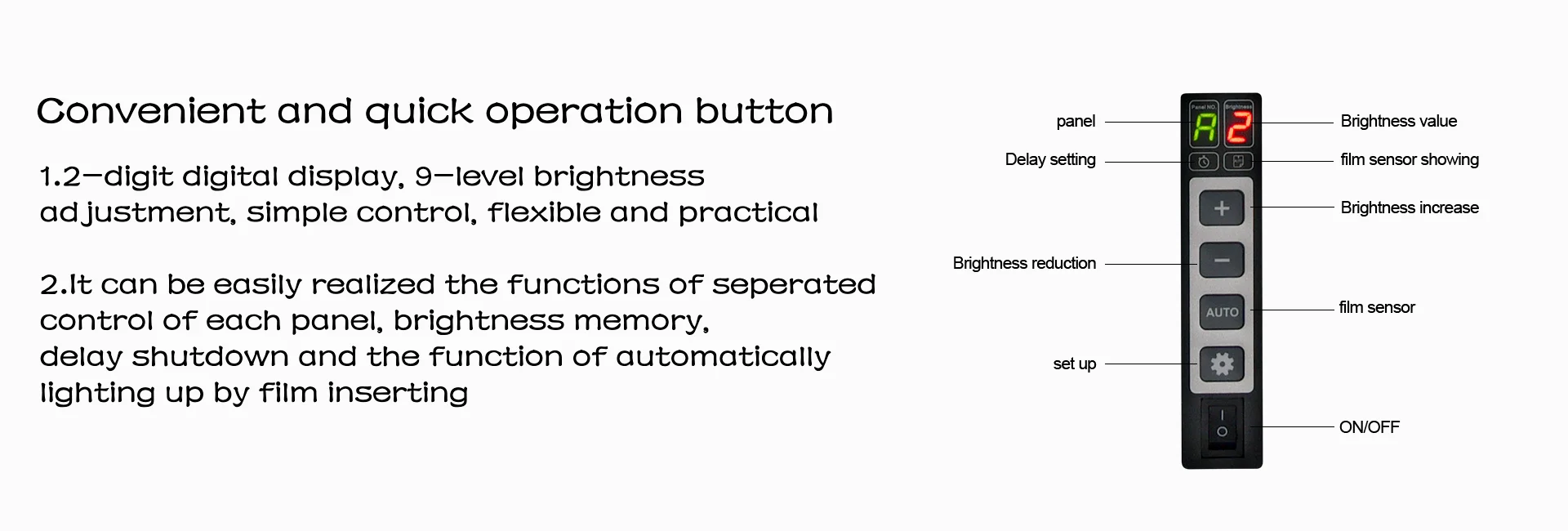 Application function | seperated control of each panel , film sensor, lighting up by inserting film,brightness memory, delay shutdown | |
