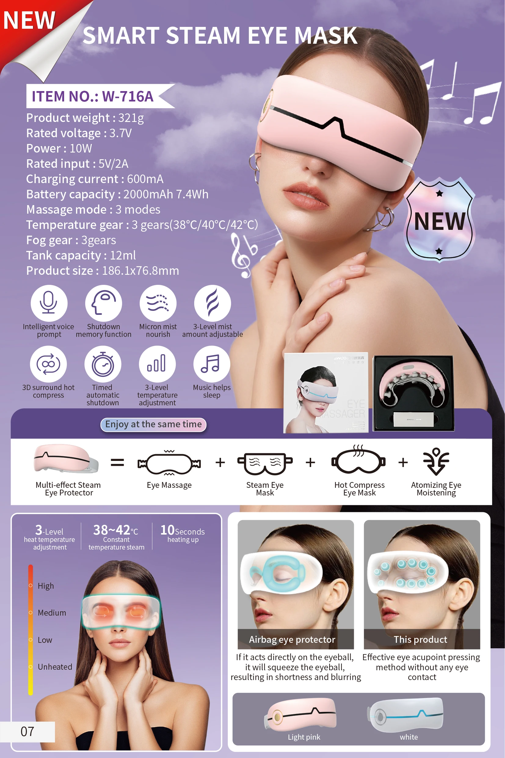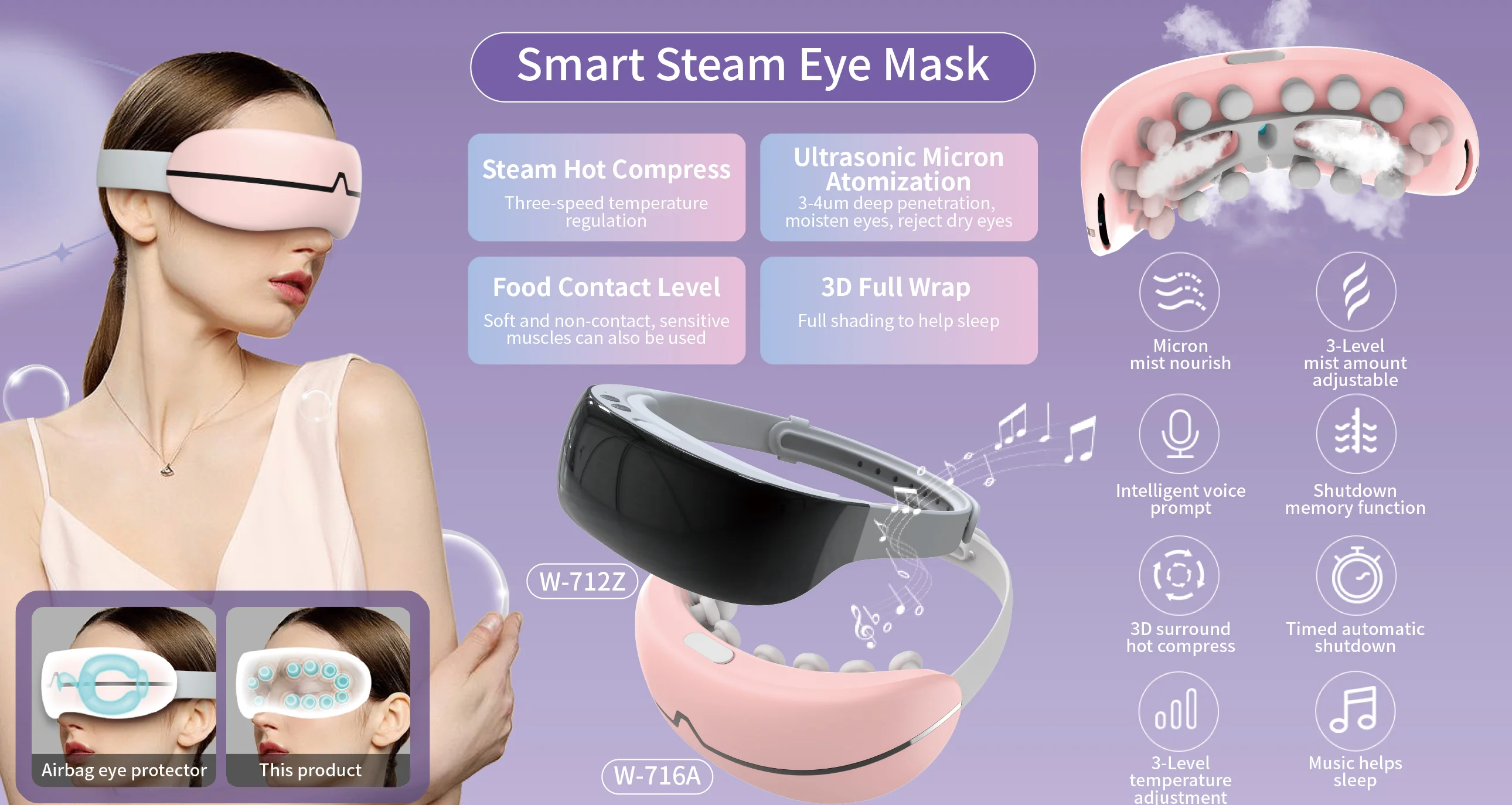 Function: Relieve eye strain, eyes treat dry eyes, pink eye. This moisturizing hot therapy promotes blood circulation for your under eyes, relief for migraine, Headache, Dry eyes, allergies, dark circles, puffy and itchy eyes. Rechargeable: More environment friendly, more convenient, more economical than disposable hot steam eye mask. Nanoscale atomization: Real nano atomization, moisturizing eyeball and eye skin, but will not collect water droplets around the eyes, affect your makeup. Musical: Built-in speakers and prerecorded sound enhance relaxation. You can turn it off by pressing a button or by voice command. AI Voice Control: You can switch mode or turn off music through AI voice commands. ( * You can customize voice commands for your brand.)