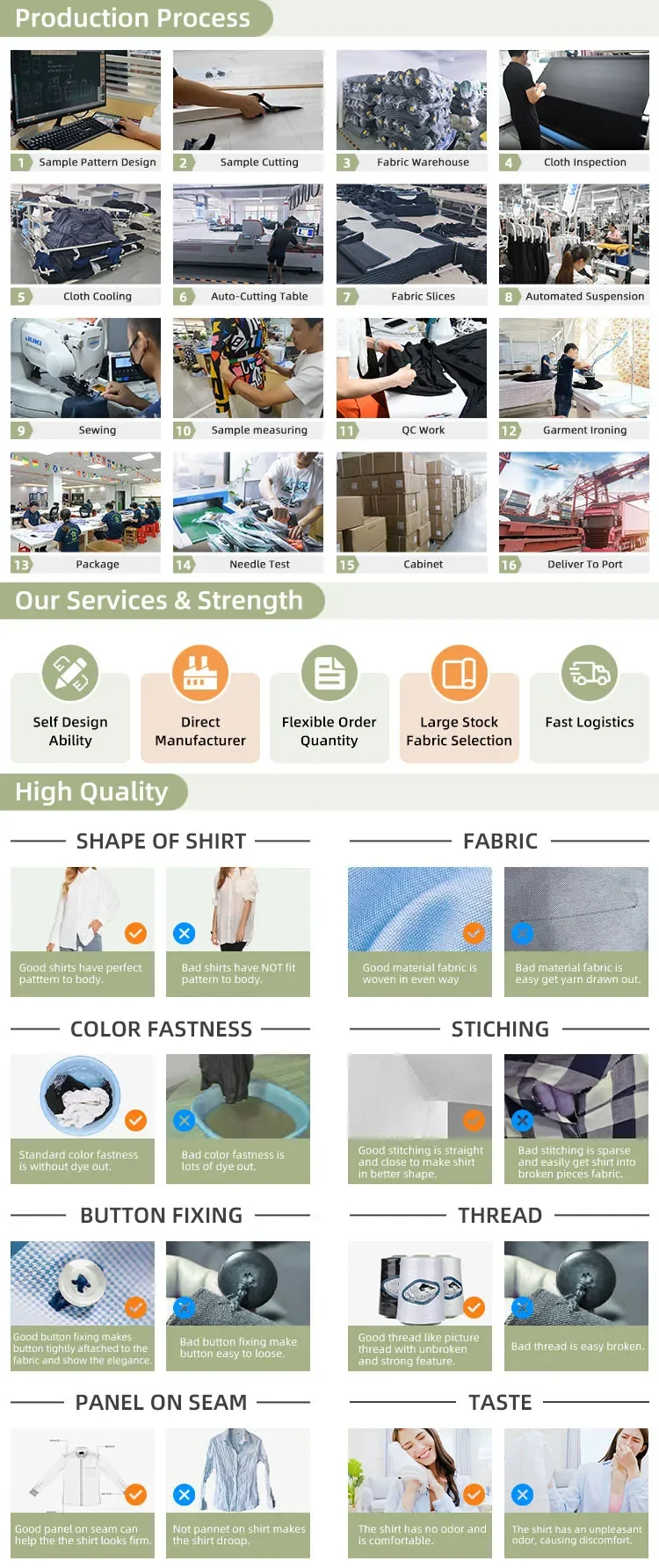 Q4:What's the price? A4:The price depends on quantity, fabric, shirt workmanship, size range, package, etc. Based on the market research and wholesaler client feedback, the price we offered are competitive enough to help them get more market share in the following years.