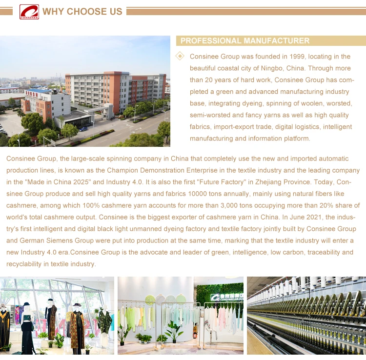 Consinee chooses the most healthy andeco-friendly high quality natural fiber like cashmere, merino wool, yak, mohair, alpaca, angora, linen, silk, cotton etc. as ouryarn material. Consinee yarn is proceeded by biological reactive dyeing assistants and dyeing assistants imported from Swiss and Germany with the most updated sewage treatment and cycling system. All of our yarn has authorized by ISO 9001, ISO 14001, and OEKO-TEX 100 test system.