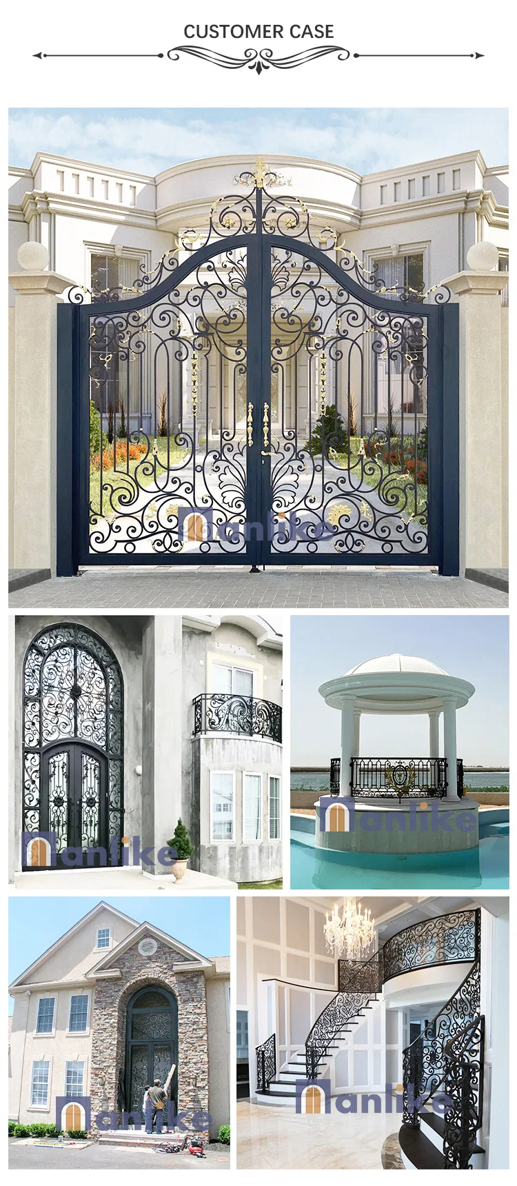 Anlike Luxury Fancy Villa Anti Corrosion Entry Royal Metal Front Double Swing Main Driveway Wrought Iron Gate