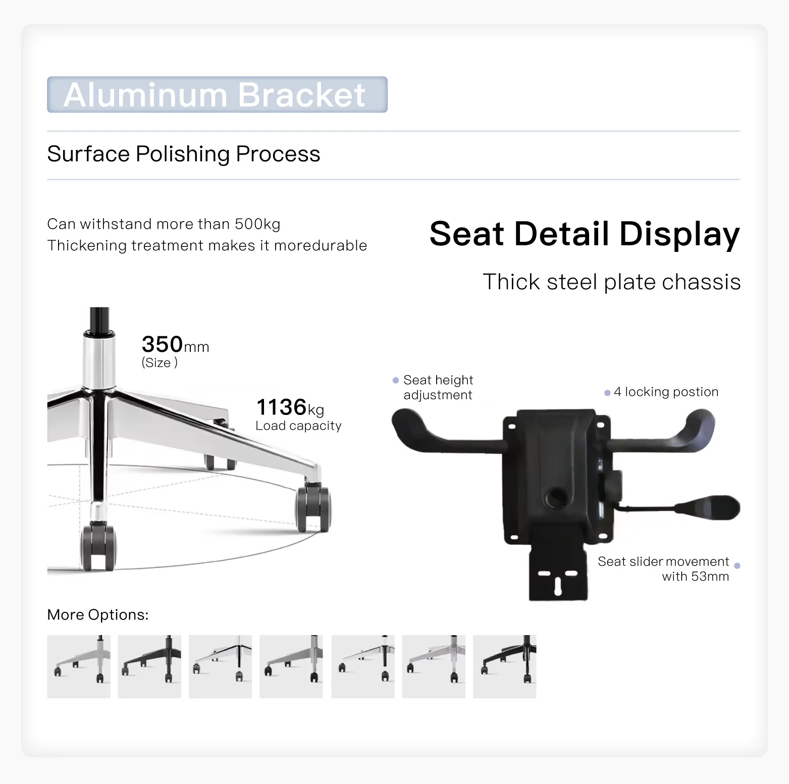 Caster/Base | 345mm nylon base | Mechanism | Self adjustable mechanism 4 locking postion | |||