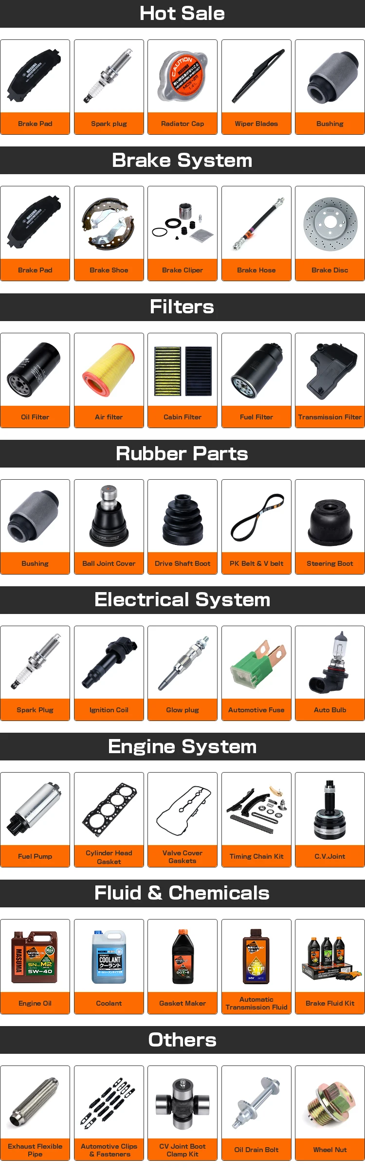 Masuma specializes in the design, development, manufacturing, sales and service of Japanese, German, American, Chinese and Korean auto parts. The current products include lubricating oil, transmission fluid, brake oil, brake pad, brake disc, filter, spark plug, ignition coil, ball joint, swing arm, shock absorber, belt, wiper, water tank cover and other series, over ten thousands ofvarieties, and products are sold to more than 100 countries and regions in the world.