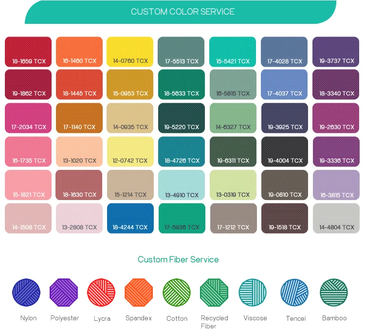 Material | 1:87% Nylon+13% Spandex,305-315GSM; 2:75% Nylon+25% Spandex,230GSM; 3:87% Polyester+13% Spandex,280-290GSM; 4:75% Polyester+25% Spandex,250GSM; |