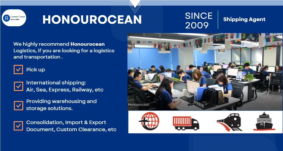 Shenzhen honourocean shipping co.,ltd is a Logistics Service Provider in china since 2009. As a leading international freight forwarding and logistics company, we offer full-service solutions to make sure your products get delivered on time anywhere in the world. We provide reliable and cost-effective rates for your shipments with competitive pricing through our global network of agents, partners, and warehouses. We offer ddp shipping services in the USA, Canada, UK ,Australia,Europe,Japan, Philippines,Malaysia,South Africa,Saudi Arabia, United Arab Emirates, Mexico ,Indonesia and so on. Honourocean service including sea shipping, air shipping, railway transport from china to worldwide . |
